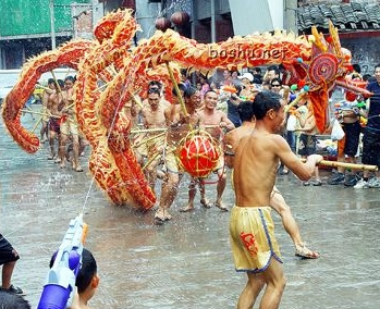 潑水龍,是用柳樹(shù)條扎成,由龍頭、龍身、龍尾和滾寶組成。龍的全身一般為12洞,即每月一洞,閏年為13洞。龍身不糊紙,不披布,只通插柳條,取“愿得柳枝甘露水”之意,并有魚(yú)、蝦、蚌、蛤等執(zhí)事陪襯。龍頭有眼、鼻、嘴、舌、角、須,形象逼真,龍尾翹上,能左右搖擺。舉龍頭的人一般為土家山寨有名望的長(zhǎng)者,龍身、龍尾可由任何人舉。滾寶,也是用柳條編成如圓球狀,在龍口前上、下、左、右飛舞,形成“龍搶寶”。表演時(shí)赤膊者沿街舞龍,圍觀者以水潑之,舞龍人被淋得全身濕透,以此祈求天降大雨,水越多則預(yù)示雨越大,故周?chē)逭巳藚⒓印?BR>    如今已發(fā)展成為對(duì)喜慶節(jié)日的慶祝,對(duì)美好生活祝福的一種方式。它用鮮棕葉作龍須,用葛藤、黃荊條、松樹(shù)枝作龍身,分9節(jié)、11節(jié)、1 3節(jié)、15節(jié)等不同長(zhǎng)度的奇數(shù),由9至15人參加舞龍。伴著鑼、鼓、鎖吶的鏗鏘樂(lè)曲,一人持“寶”在前,龍舞歡騰時(shí)有“二龍搶寶”、“蛇蛻皮”、“烏龍絞柱”等50多種動(dòng)作玩法。與此同時(shí),身著民族服裝的群眾用臉盆、水瓢、銻桶等容器端水圍繞著龍潑澆,這樣邊舞邊潑水、水潑得越多龍舞得越歡,也預(yù)祝大家當(dāng)年風(fēng)調(diào)雨順,五谷豐登,其場(chǎng)面歡樂(lè)喜慶,風(fēng)趣幽默。已列入我市第一批非物質(zhì)文化遺產(chǎn)保護(hù)名錄。