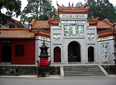在岳麓山半腰,系晉初古寺,是佛教人湘最早的一所大寺。明神宗時(shí) 更名為萬(wàn)壽寺,民國(guó)初年復(fù)名,古麓山專。唐代大詩(shī)人杜甫曾用“寺門高開 洞庭野,殿腳插入赤沙湖”的詩(shī)句稱頌殿字宏大。大雄寶殿等主要建筑,于 1944年被炸毀,僅存山門和觀音閣,現(xiàn)已修整一新.山門上有“古麓出寺” 的橫額,兩旁為“漢魏最初名勝,湖湘第一道場(chǎng)"對(duì)聯(lián),門外古楓參天,濃 蔭覆蓋,門內(nèi)園圃百花爭(zhēng)艷。觀音閣為磚木結(jié)構(gòu),1955年曾加以修葺,1980 年再次修整恢復(fù)原貌,并在廳堂神龕中置觀音像。閻內(nèi)常舉辦小型書畫展 覽。觀音閣前有兩株羅漢松,左邊一株是六朝遺跡,稱“六朝松",樹 齡在1700年以上, 是岳麓山植物界的"元老", 老干新枝,紛繁翁 郁,彌足珍貴;右邊一株于清代被巨風(fēng)拔去并被清代人補(bǔ)植。兩棵古松 并峙于閣前,游人樹下經(jīng)過(guò),若入關(guān)隘,故有“關(guān)松"之稱。