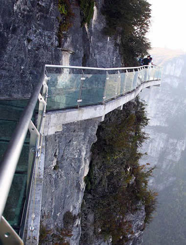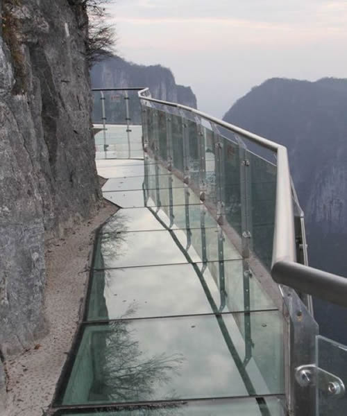 2011年10月1日,張家界天門山國家森林公園新建的玻璃棧道正式對游客開放。玻璃棧道懸于天門山頂西線,長60米,最高處海拔1430米。是張家界天門山景區(qū)繼懸于峭壁之上的鬼谷棧道、憑空伸出的玻璃眺望臺、從玻璃臺可以看見下面。玻璃臺伸出棧道有4-5米,專供游人拍照、橫跨峽谷的木質(zhì)吊橋后打造的又一試膽力作。為了讓游客零瑕疵的透過玻璃橋看到美麗的風(fēng)景,上橋的游客均要求戴上鞋套,以保持玻璃橋的透明和干凈。玻璃棧道的刺激震撼,可與舉世聞名的美國大峽谷玻璃走廊“天空之路”媲美,因而有了東方“天空之路”的美譽(yù)。