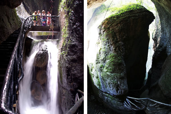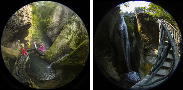 走在吊橋中間,必須保持自身的平衡方能安全通過,不然就會(huì)在吊橋上搖擺不定。走出仙女峽谷,往下看,深不見底,七潭七瀑在奇險(xiǎn)之中不乏壯觀,這里曾發(fā)生過跳潭救女的故事。