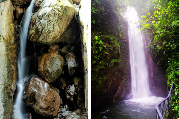 西線原名叫雪花溪,又叫雪花洞,水從懸崖上掉下來濺起水花,泉水與巖石相碰,落成大霧,形成雪花狀,故名雪花溪。因地勢(shì)險(xiǎn)峻,歷代人都沒有把雪花溪走通過,從下往上看深不見底,古人以為是一個(gè)洞,故又叫雪花洞,其實(shí)是一個(gè)峽谷,有七潭七瀑,現(xiàn)在叫“仙女峽谷”。峽谷長(zhǎng)800米,最窄處僅1米左右,上下落差近200米,因水的長(zhǎng)期回旋沖刷, 巖層的堅(jiān)硬度各異,形成了底寬頂窄,時(shí)北,時(shí)西,時(shí)東,陰暗無光,形似溶洞, 泉水飛流直下,形成梯級(jí)瀑布,擊打在巖壁上濺起的水花猶如雪花飛舞,潭中一片雪白,古人稱之為雪花洞,峽谷中有七個(gè)各異的潭池在沖擊的水花中若隱若現(xiàn),故改稱為七仙女人間沐浴瑤池,從開天辟地起無人行通過,現(xiàn)在已修好的占道,于峽谷水花之中,幻入仙境之感。