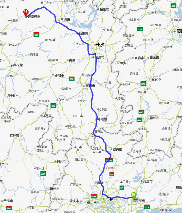 梅州去張家界自駕車自助游線路圖全程高速):