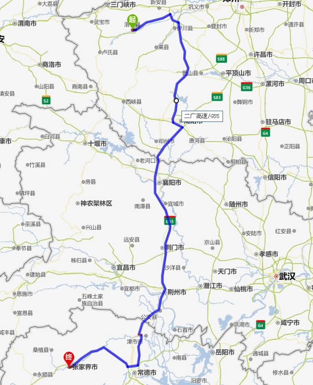 左右,沿途經過洛寧——伊川縣——汝陽縣——南召縣——南陽——襄陽——荊門——荊州——常德(也可以走國道經澧縣、石門縣)——慈利——張家界。