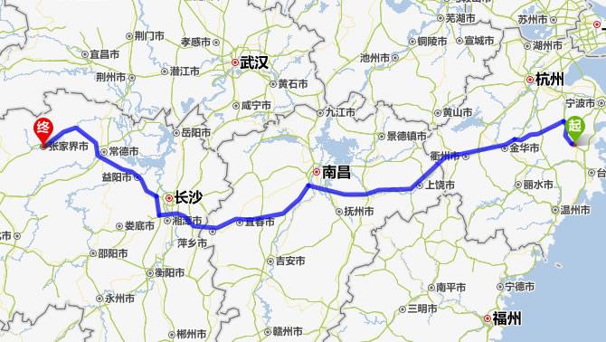 天臺去張家界自駕車自助游線路圖全程高速):