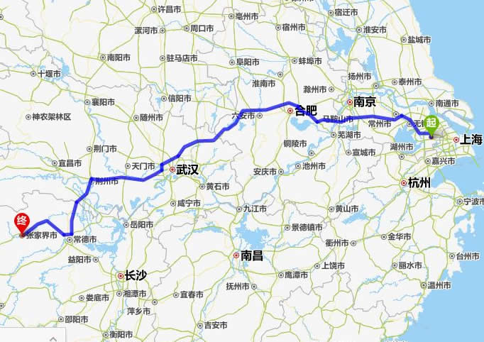 左右,沿途經過清江——無錫市——馬鞍山市——合肥——六安市——麻城市——仙桃市——潛江市——荊州市——常德市(這里可以不走常德,直接從荊州經澧縣、石門縣到慈利縣)——慈利縣——張家界。