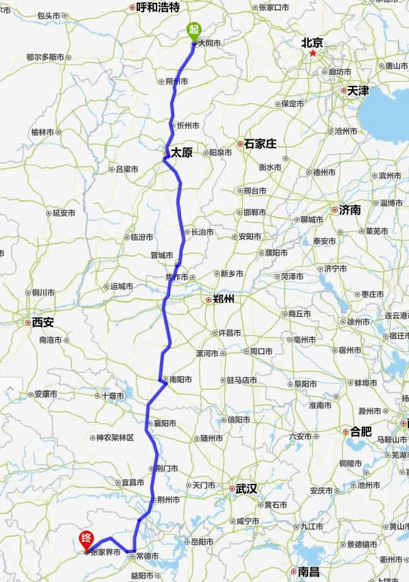 左右,沿途經過大同——朔州——忻州——太原——長治——焦作——南陽——襄陽——荊門——荊州——常德(也可以走國道經澧縣、石門縣)——慈利——張家界。