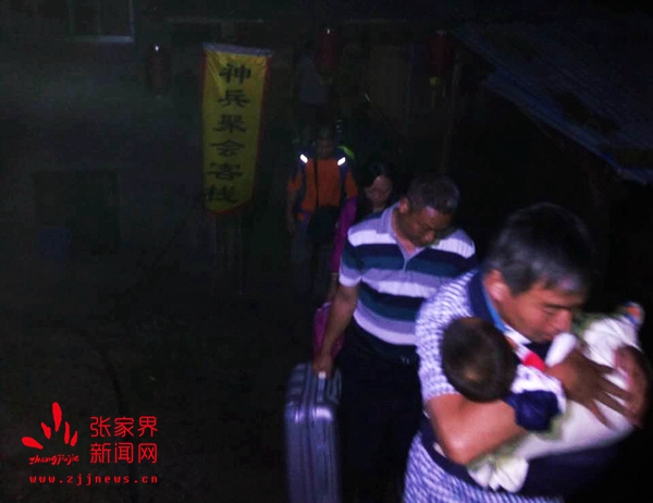 晚上9時許,由天子山景區(qū)管委會干部職工、居委會居民組成的應(yīng)急隊伍冒雨趕到老屋場,對入住游客和當?shù)鼐用褚灰贿M行耐心解釋,勸導(dǎo)他們連夜轉(zhuǎn)移到安全地帶。