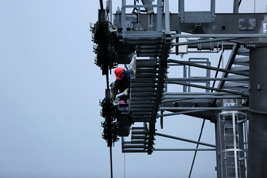 圖為正在對天子山索道進行巡檢的工作人員